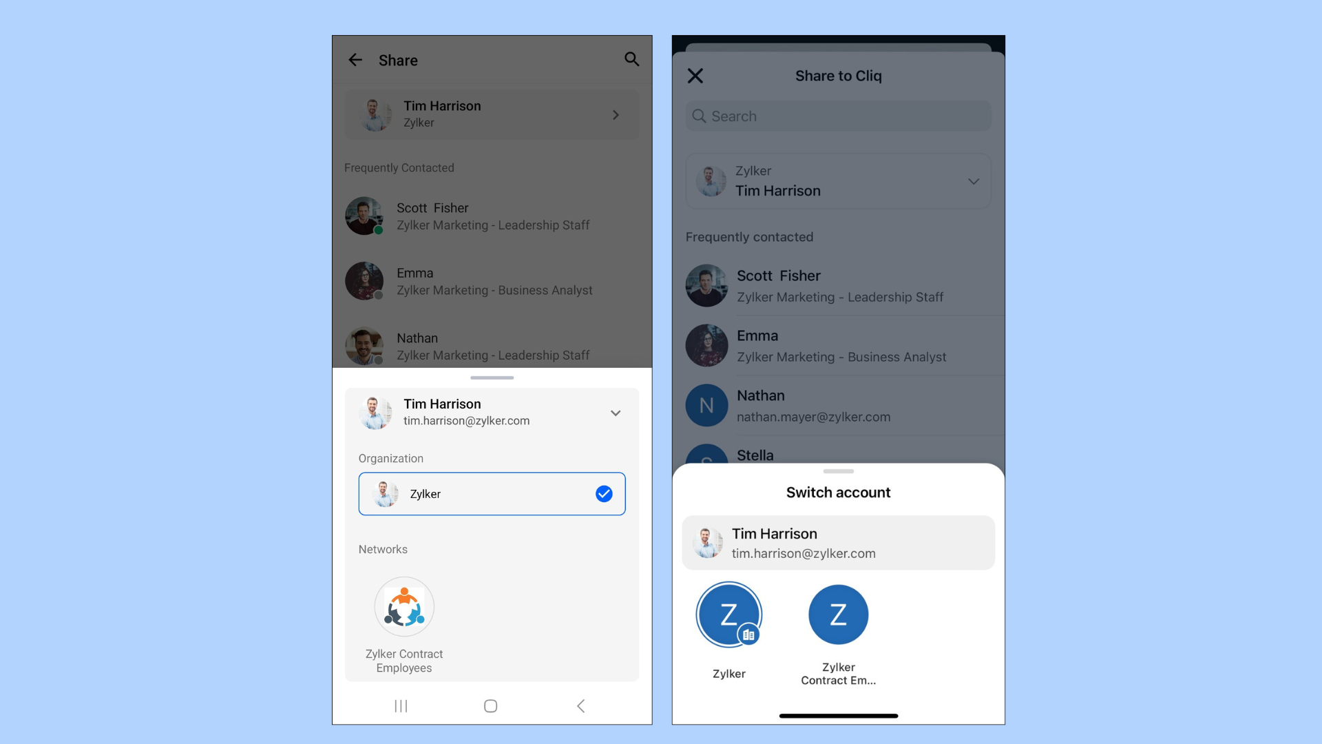 AndroidiOSWant to share an image from your gallery, a document from your file manager, or source from any app? Just tap Share, choose Zoho Cliq, and send it instantly to the accounts or networks you’re already logged into without switching the app.