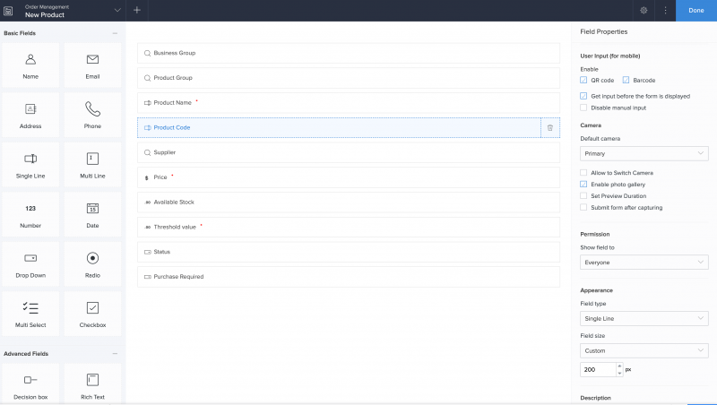 Every form has a properties panel on the right-hand side. This is where you can enable QR and bar codes so that your team members can add a product just by scanning its code. Every field also has a properties panel that opens up when you click on a field.
