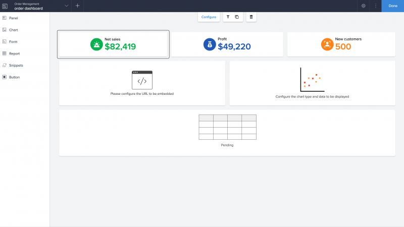 Zoho Creator uses Pages to create dashboards. This is also a drag-and-drop interface, with ready-to-use panels that you can edit according to your requirements. Dashboards are visually appealing alternatives to traditional HTML pages.
