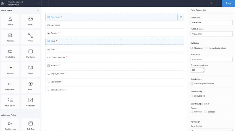 This is our employee form in the edit mode. You’re free to customize the forms and use any other details you need through the edit mode of Zoho Creator.