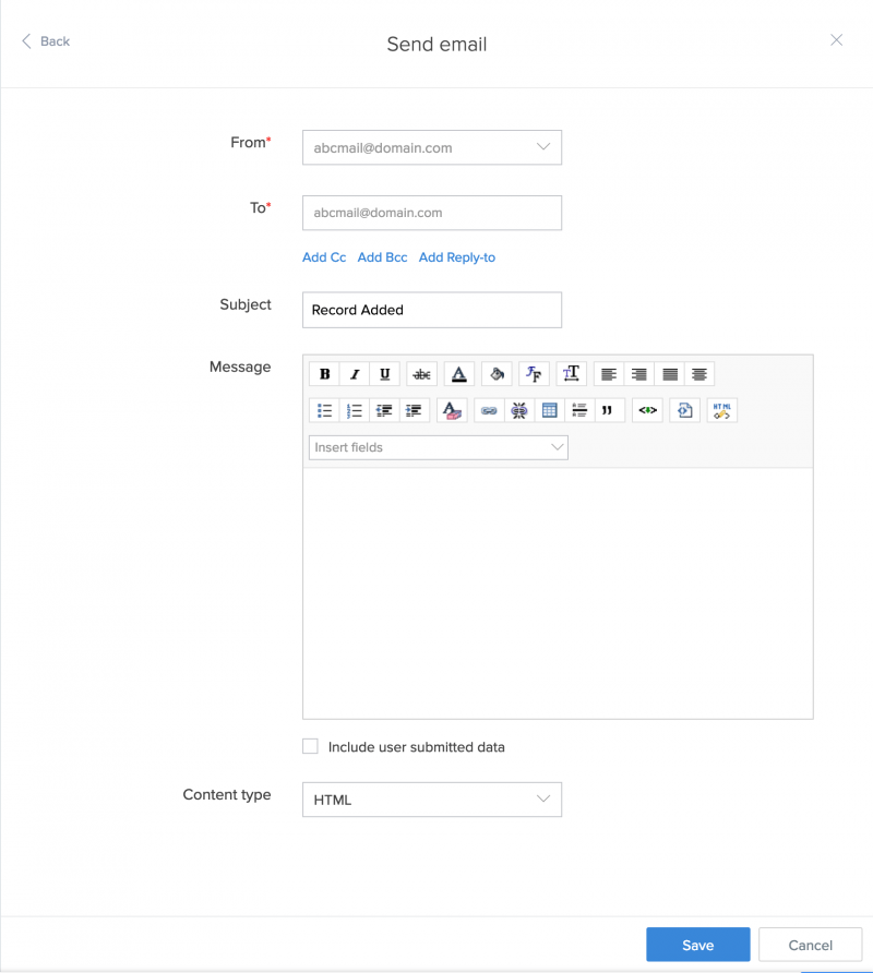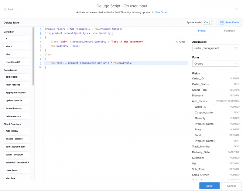 This is where you get to use Zoho Creator’s built-in programming language, Deluge. We already have pre-built blocks of code that you can drag and drop to create the workflow.