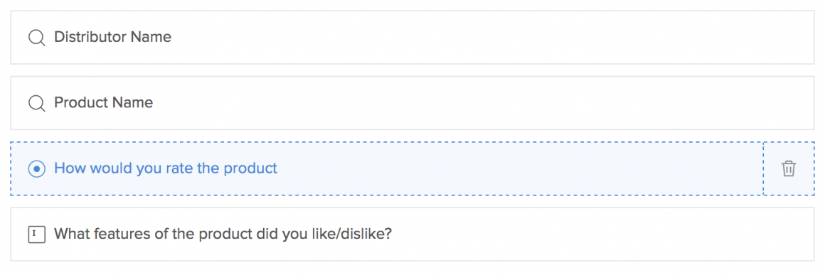Instead of adding a name and product field, however, you can add lookup fields so that this information is fetched from your distributor and product forms respectively. Not only does this make it easy for whoever submits your form, but it also ensures that your data remains clean.