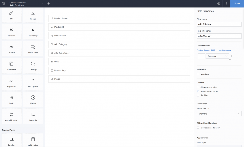Once we’ve done that, we’re ready to build the product form. This form will have basic information like name, ID, price, model, and year of make. Aside from that, we’ll also add lookup fields for category and subcategory.
