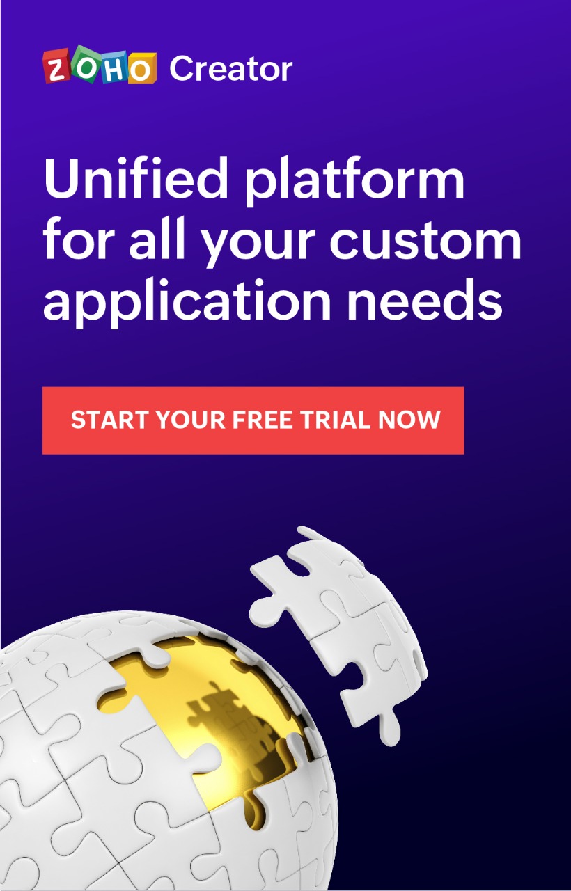 Zoho Creator is an app development tool that uses low-code technology. It consists of drag-and-drop interfaces and point and click configurations to speed up development cycles. You don’t need to write thousands of lines of code to send one piece of data from table A to table B. In most cases, you don’t even need any code.