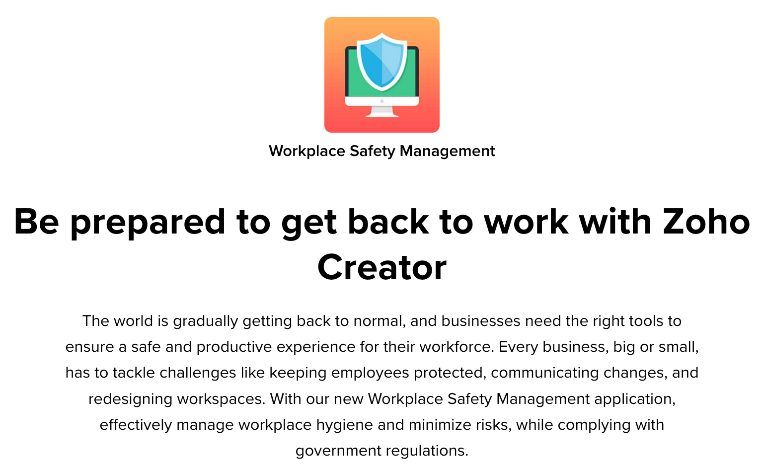 - The following apps have been added to Zoho Creator 5's app gallery: Hotel Management, Facilities Management, Business Finance Tracker, Property Maintenance Tracker, Approval Management, Employee Emergency Check-In, Site Inspector, Incident Tracker, Conference Room Booking, and Personal Finance Tracker.