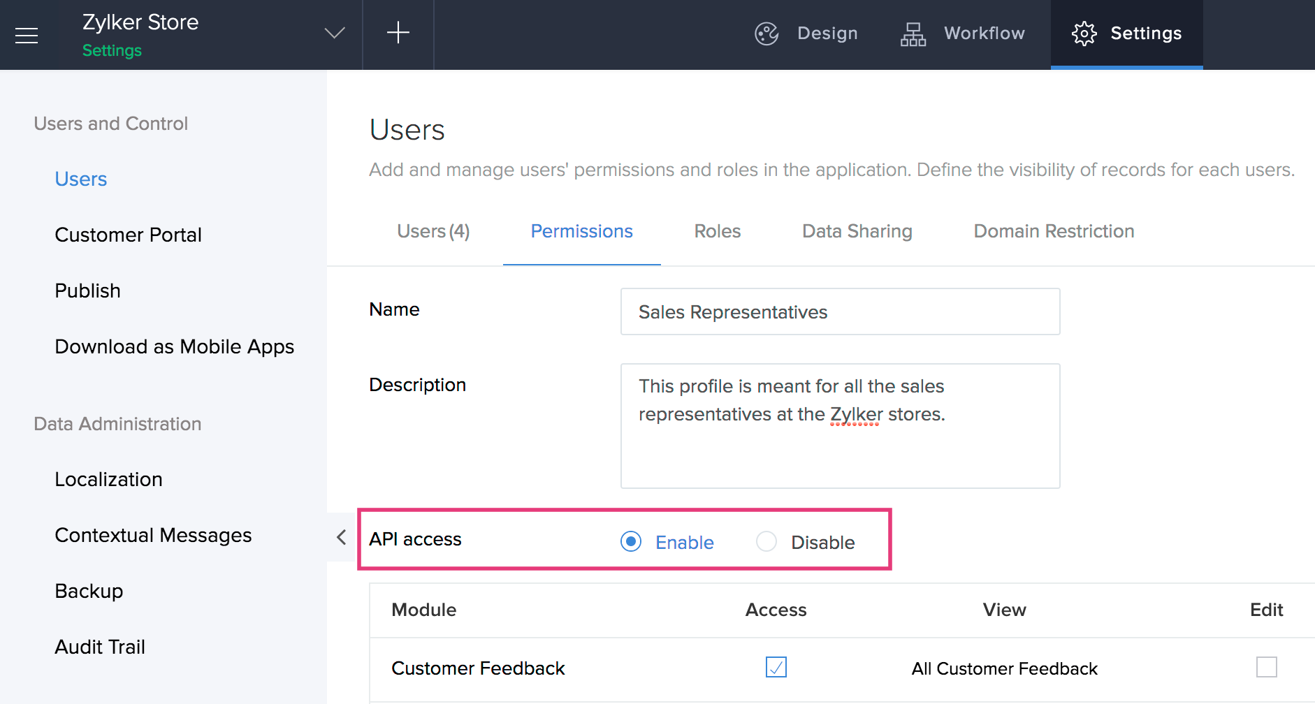- API access: This controls access to the Creator application's APIs for all users who are assigned that permission set.