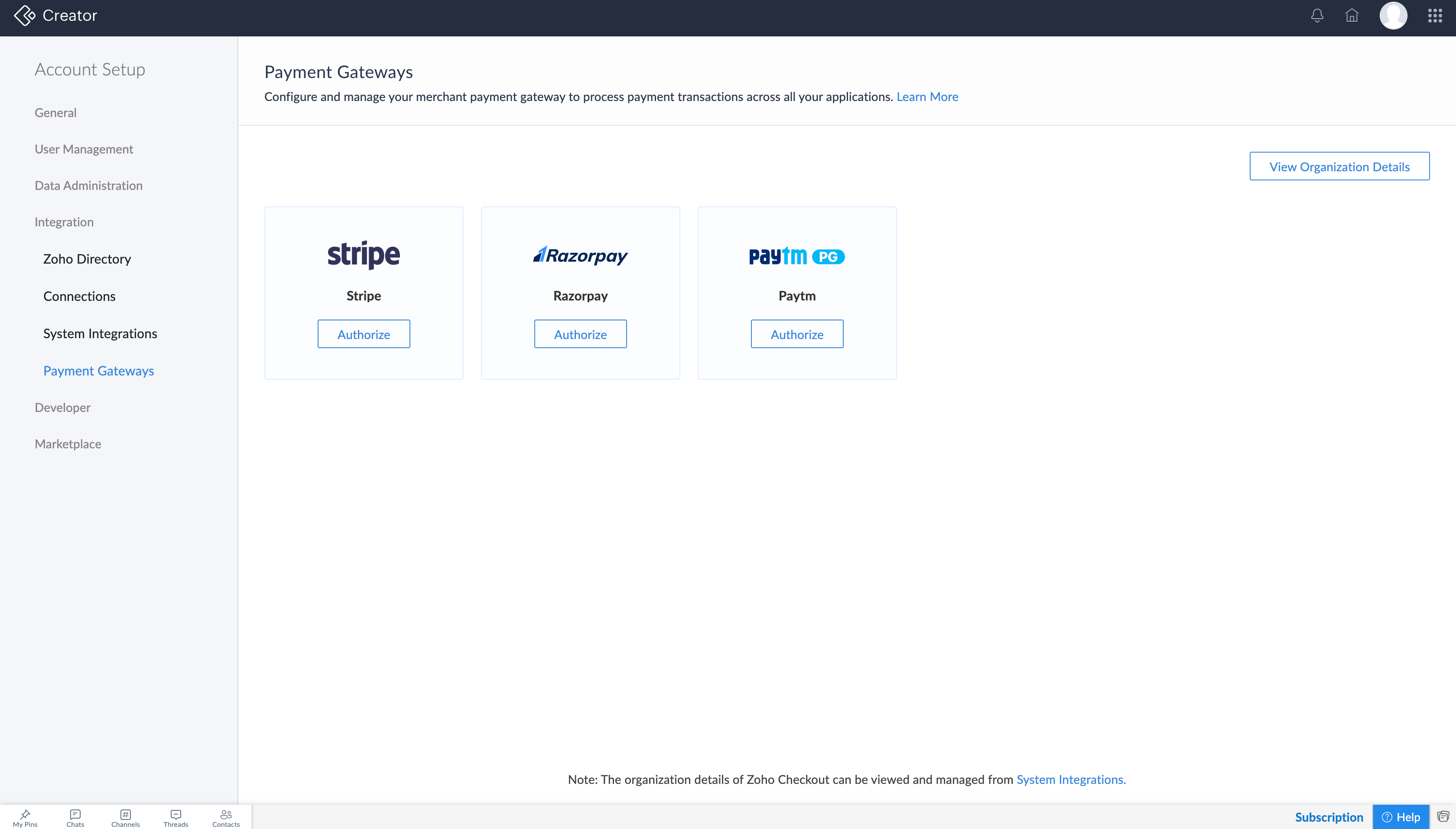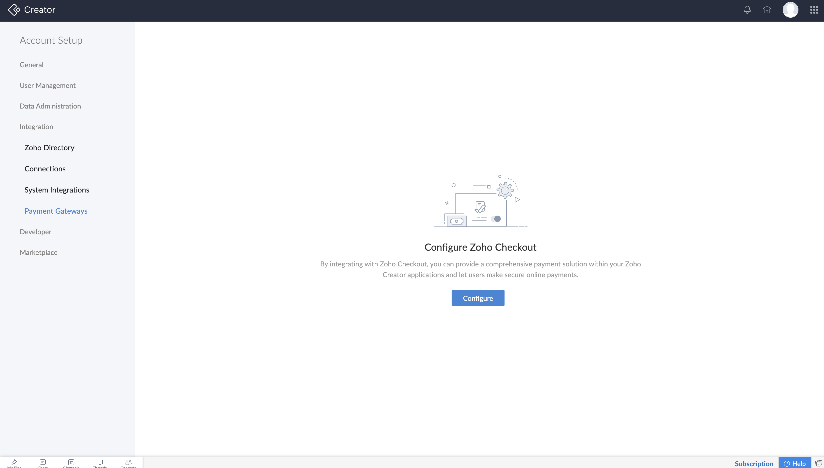 If your Creator account is already linked to a Zoho Checkout organization (configured under System Integrations), you can proceed directly to setting up payment gateways. If not, you can configure Zoho Checkout from the Payment Gateways page by following the steps below.