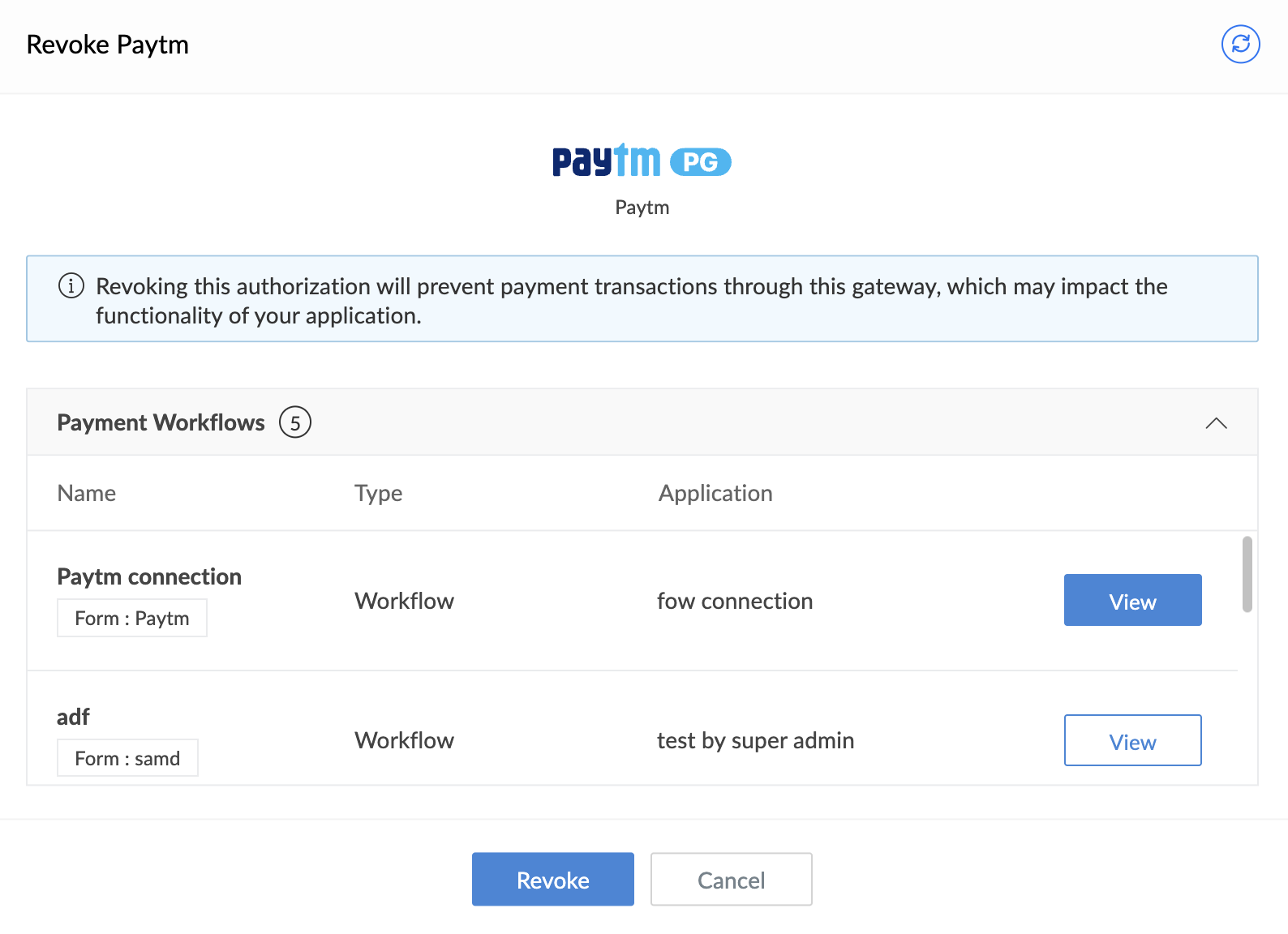 Note: If only one payment gateway is configured and it is revoked, all payment workflows will stop functioning until a new gateway is set up.