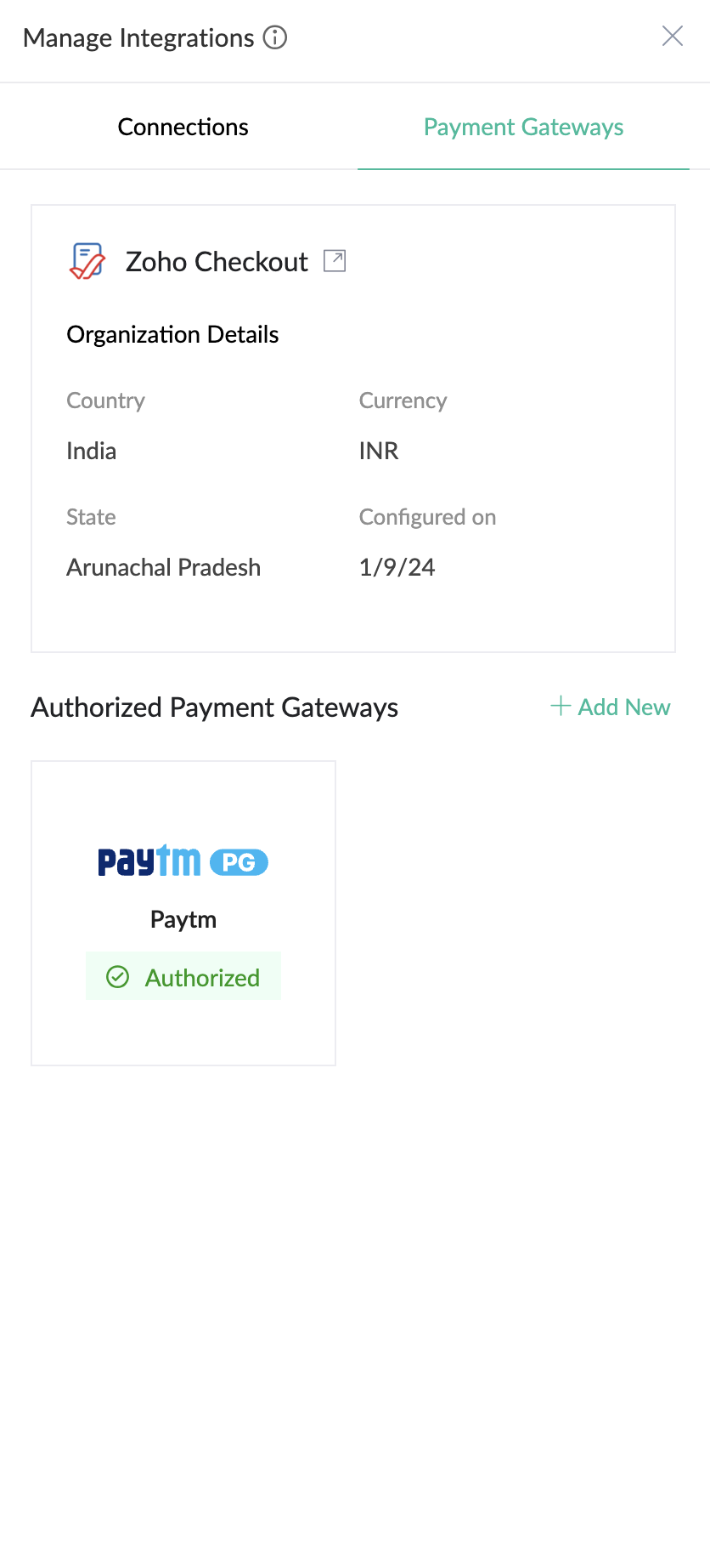 Navigate to the Payment Gateways tab (if you've also configured Connections). You can view your Zoho Checkout details and Authorized Payment Gateways in this tab.
