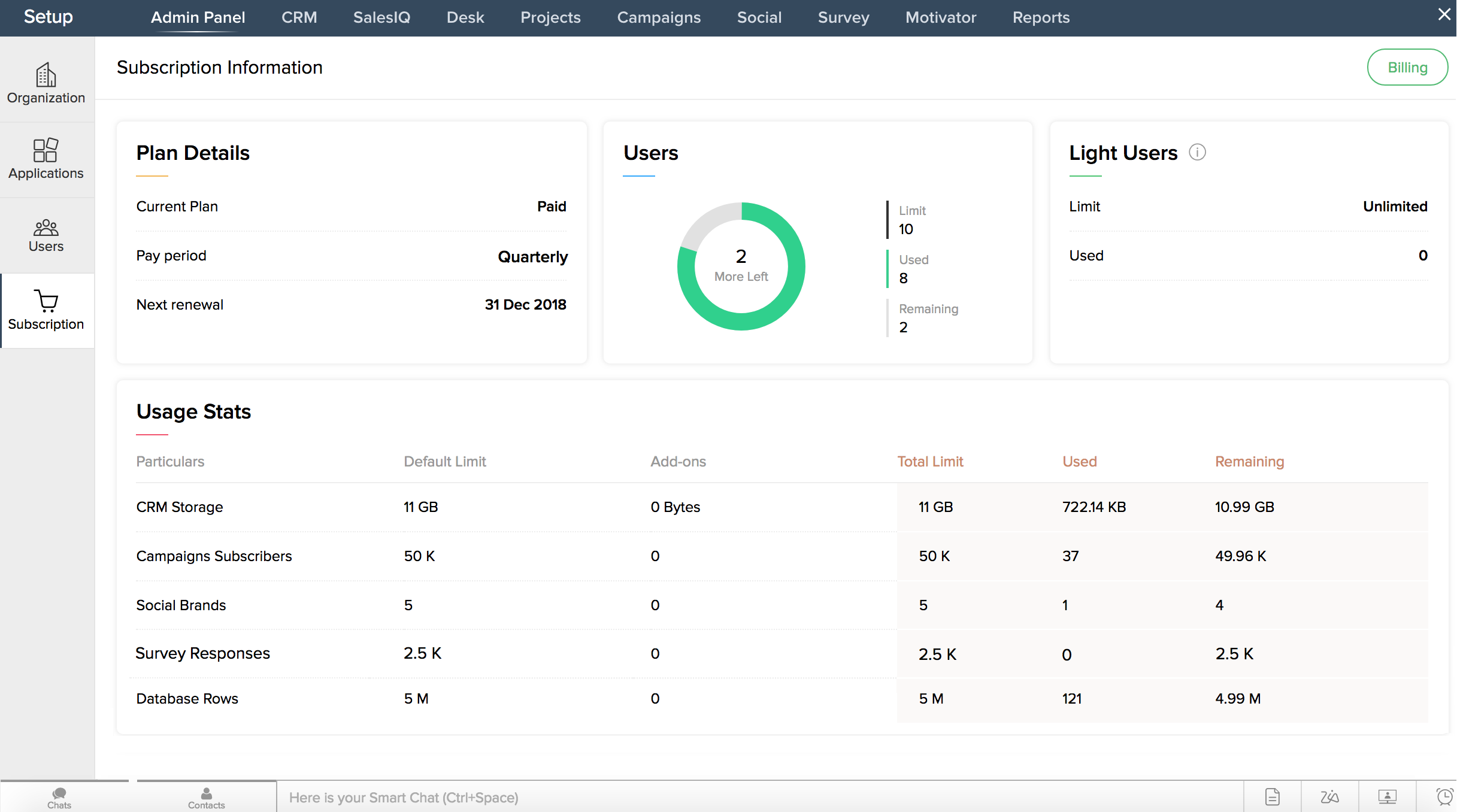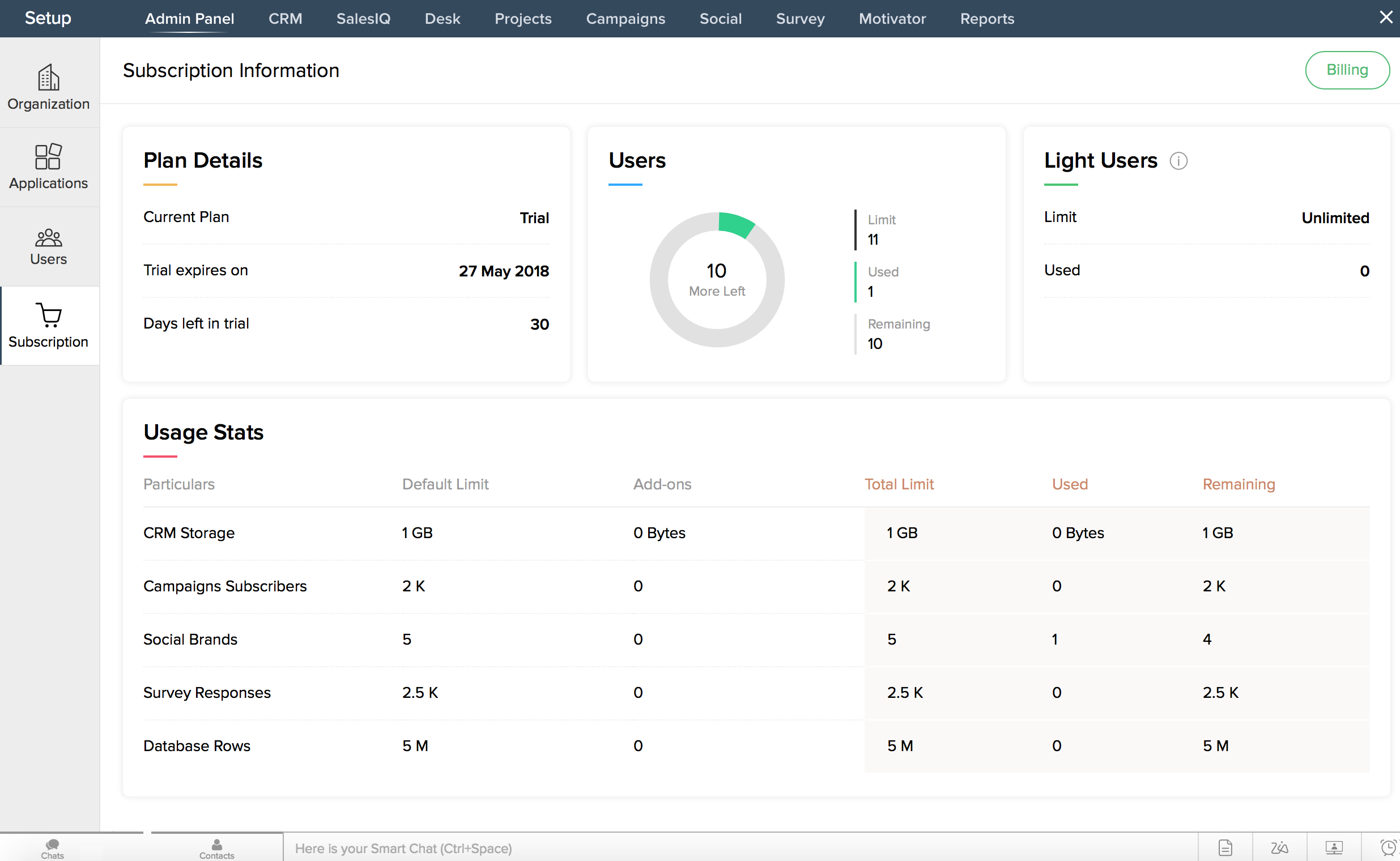 - If you are using the trial version of Zoho CRM Plus, click Billing from the Subscription Information page to subscribe to the CRM Plus plan.
