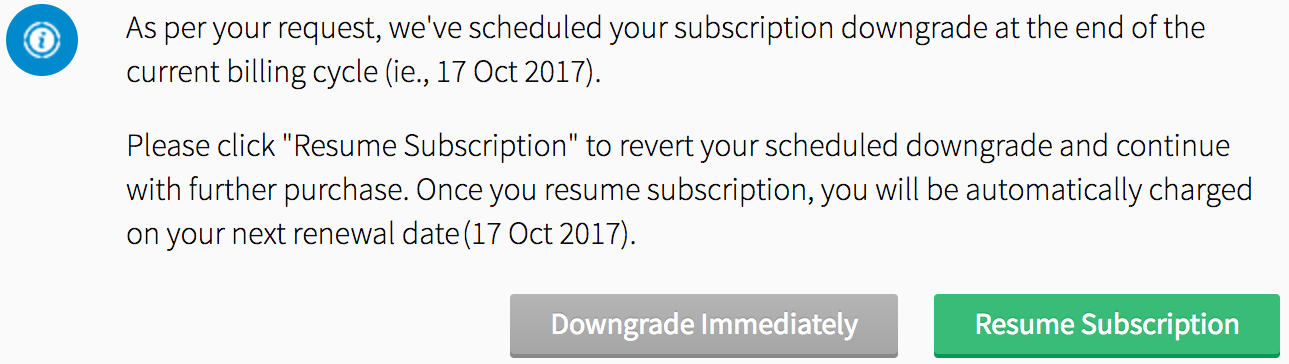 - You can click Downgrade Immediately to immediately downgrade your subscription, or click Resume Subscription to revert your cancellation.