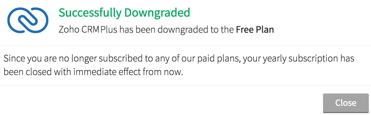 ) to return to the Manage Zoho CRM Plus Subscription page. - If you've clicked Downgrade Immediately, you'll see a message that your subscription has been closed with immediate effect and downgraded to the Free Plan.
