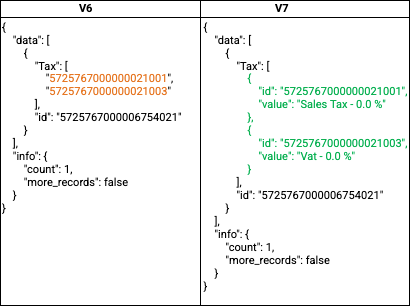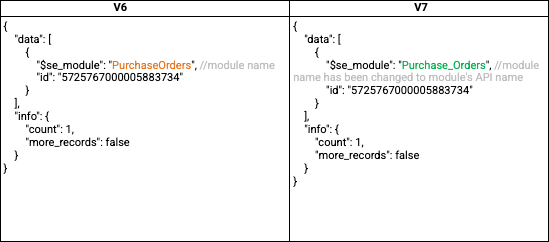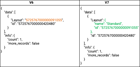 - A new "layout_associations" JSON array key is introduced in the response of the GET - Fields Metadata API from V7, representing the layouts with which the fields are associated in a module.