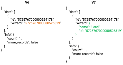 - From V7, when you specify a lookup field in the SELECT column of a query, the response includes the associated record’s display field value under the "name" key within the "lookup"JSON along with the "id" key.