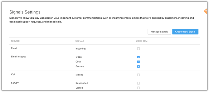 Zoho CRM offers signals that are available, by default, from its native integration with other Zoho products such as Zoho PhoneBridge, Zoho Survey, Zoho Campaigns, Zoho SalesIQ, Zoho Desk, Zoho Webinar, and Zoho Backstage.