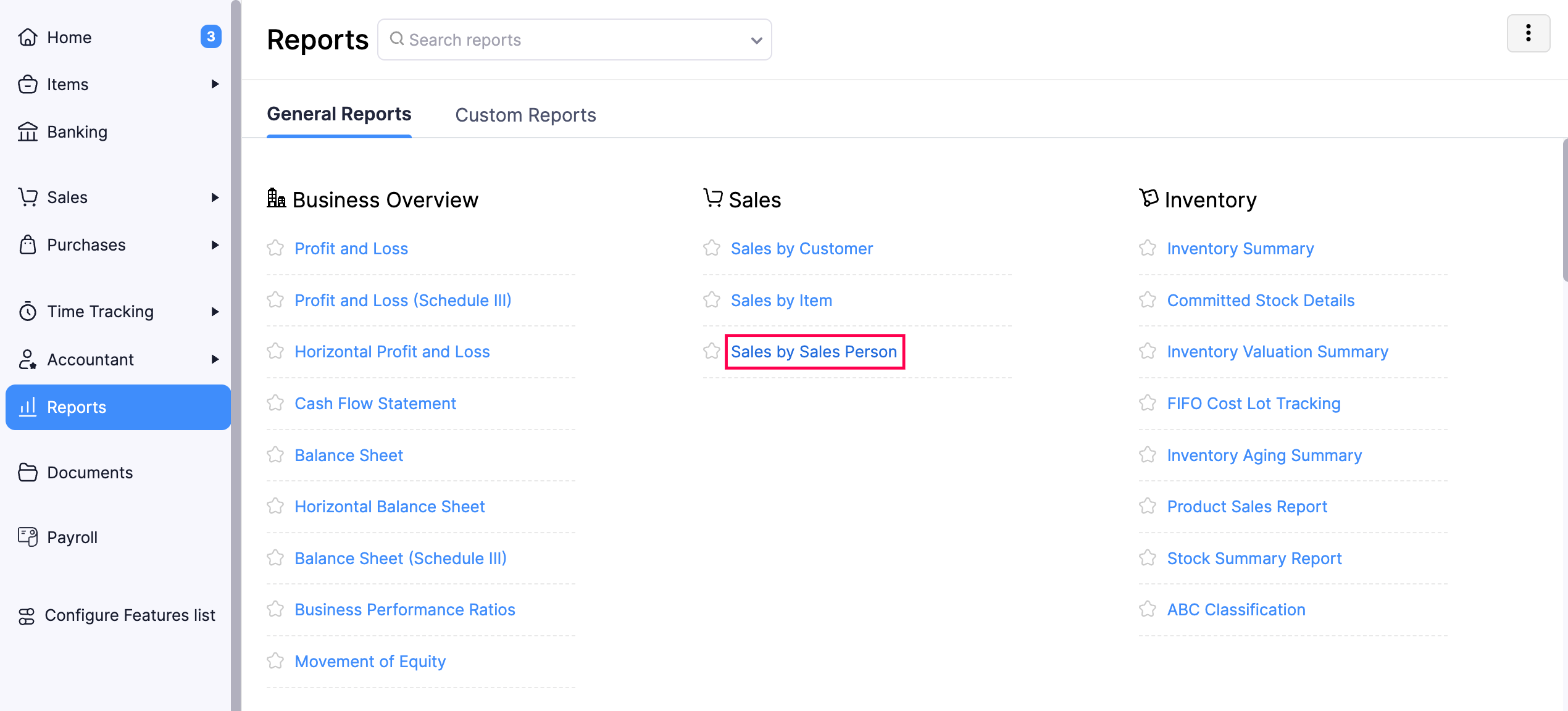 If you have associated salespersons to your transactions, you can use the Sales by Salesperson report to track the summary of all the invoices and credit notes that different sales persons have created in your organization.