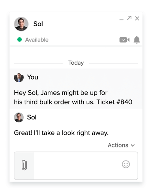 Wenn ein Kunde eine technische Frage hat, können Vertriebsmitarbeiter Supportmitarbeiter in Tickets markieren, um eine zeitnahe Antwort zu ermöglichen.