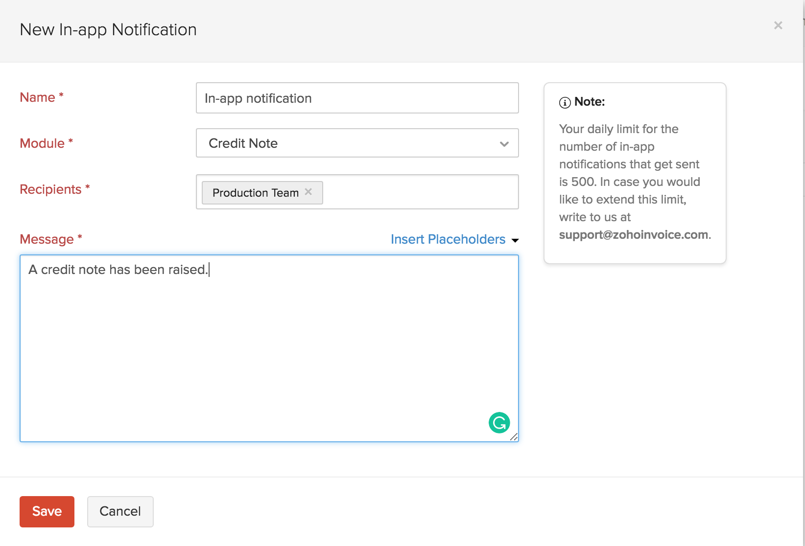 - Enter the message that needs to be to appear as a notification. You can add placeholders to your messages by choosing them from Insert Placeholders drop down.