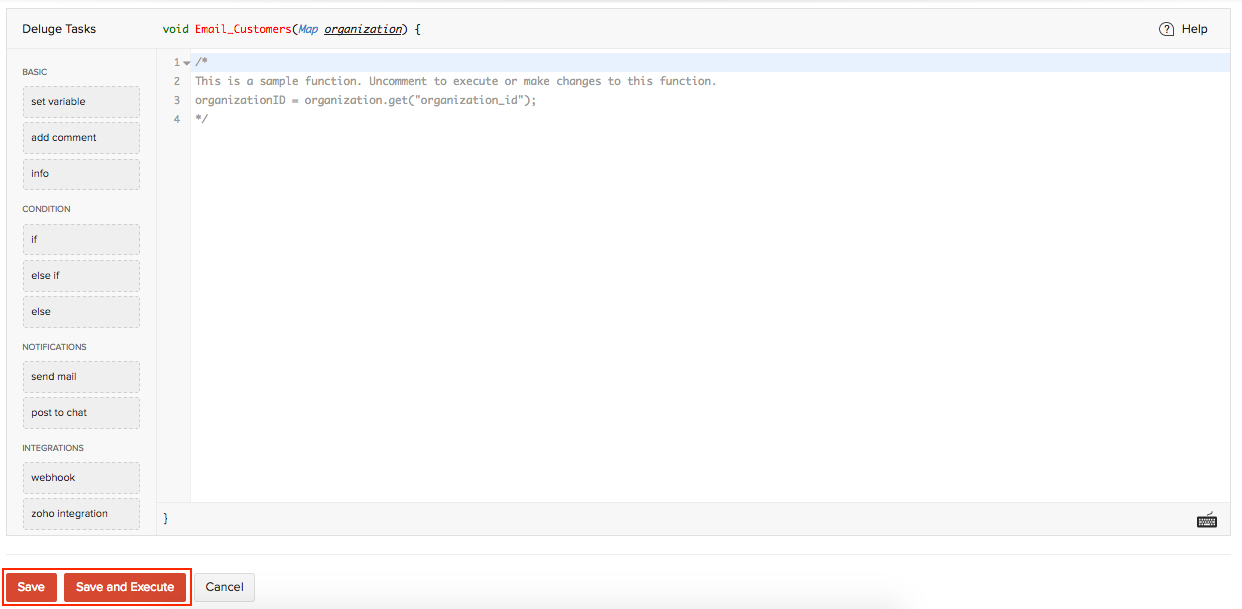 Insight: Deluge (Data Enriched Language for the Universal Grid Environment) is an online scripting language integrated with Zoho Services. It enables you to write your own functions that lets you modify the application to suit your needs, incrementally, making it more powerful and robust.