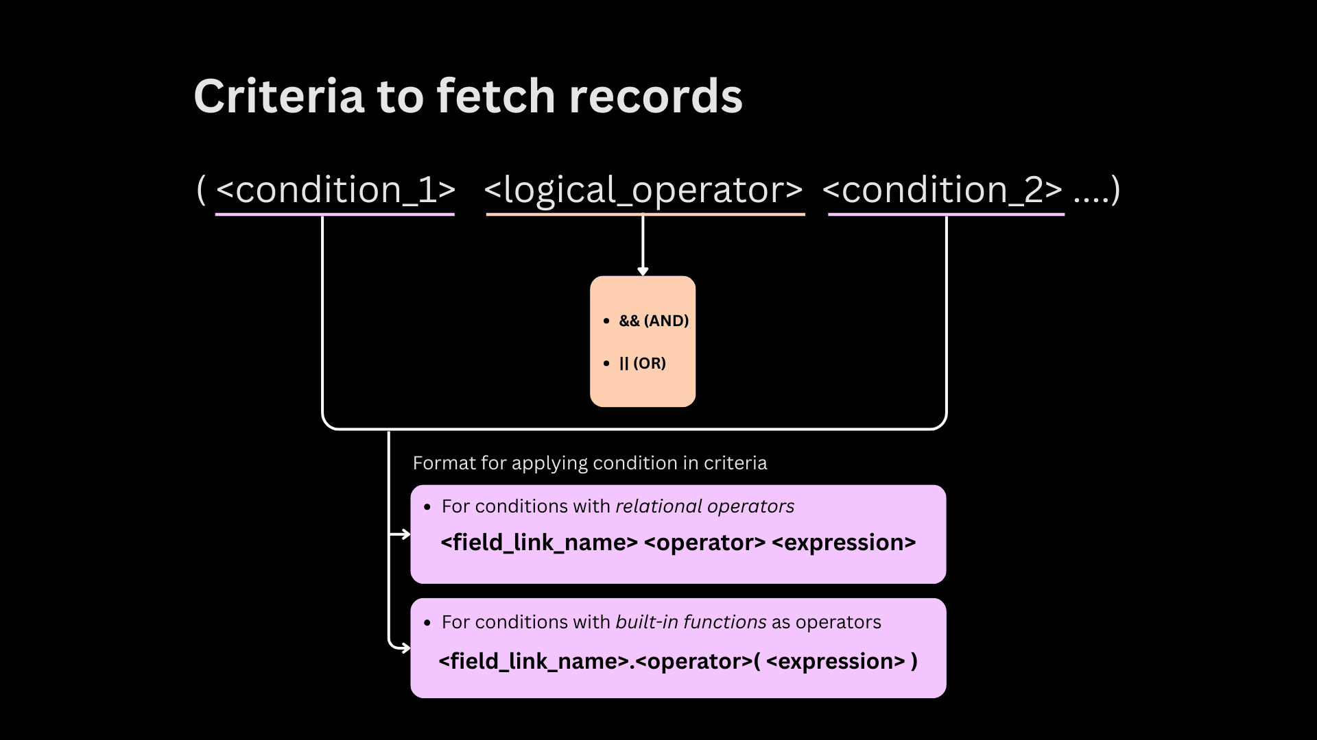 In this example, the criteria contain two conditions: one checks if the email field equals tony@zylker.com, and the other checks if the phone field matches +91xxxxxxxxxx. These conditions are joined using the logical operator &&, meaning only records that satisfy both conditions will be fetched.