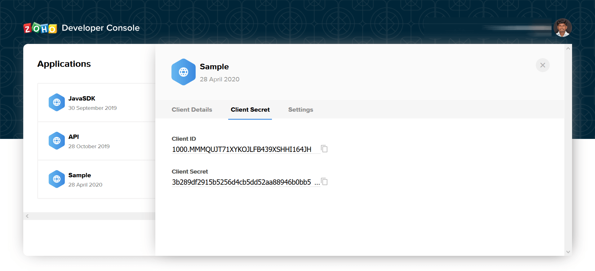 - Click the Client Secret tab to view the client id and client secret of your application.