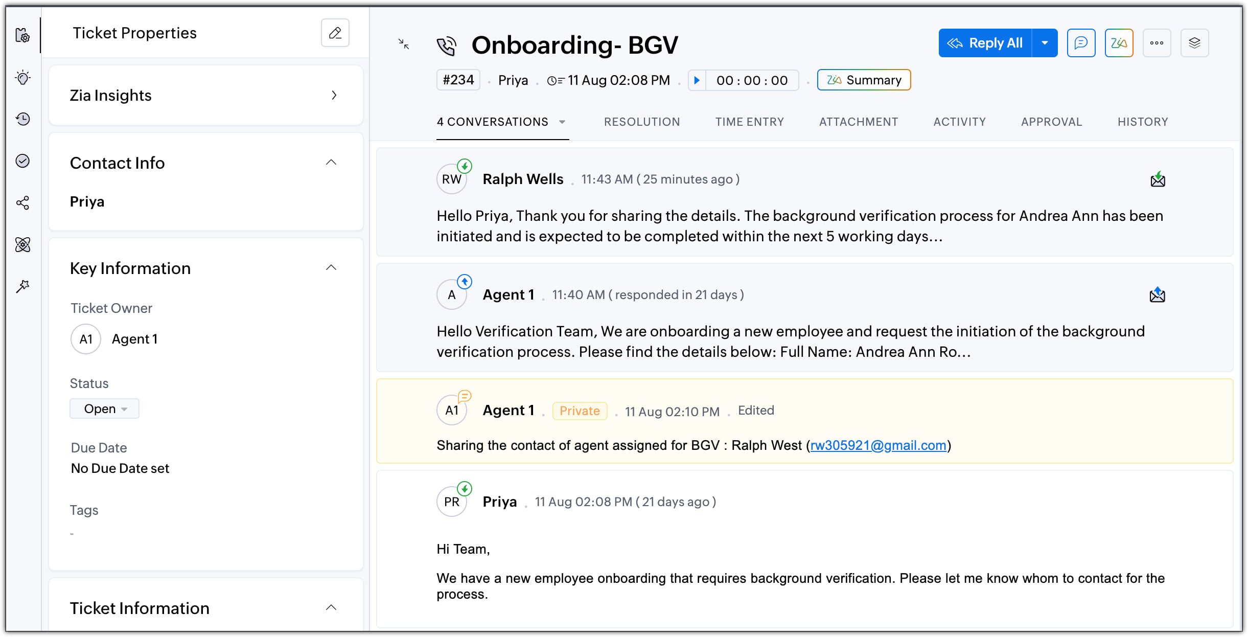 The HR executive can include the point of contact from the external verification agency as a secondary contact using CC feature in the ticket. In place of using another email service to track the communication, the external verification agency's reply to email will automatically be logged within the ticket thread in Zoho Desk to maintain transparent end-to-end communication.