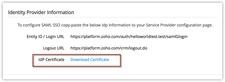 - Download the IdP certificate from the Connected App Details page in Zoho Developer Console.
