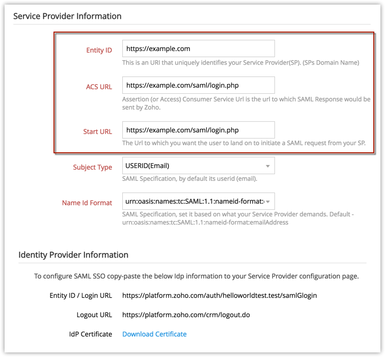 To connect your custom application with Zoho CRM, you will have to configure the SAML Identity Provider details in your application.