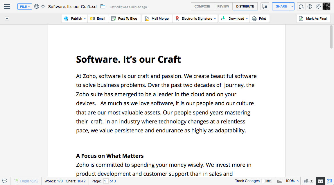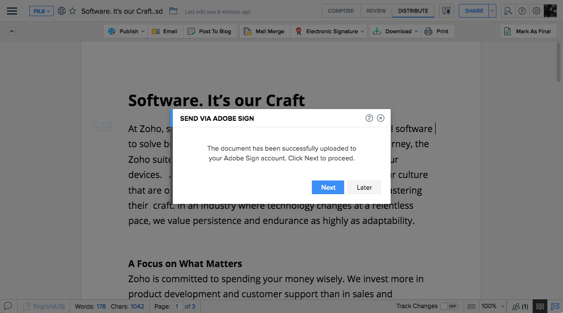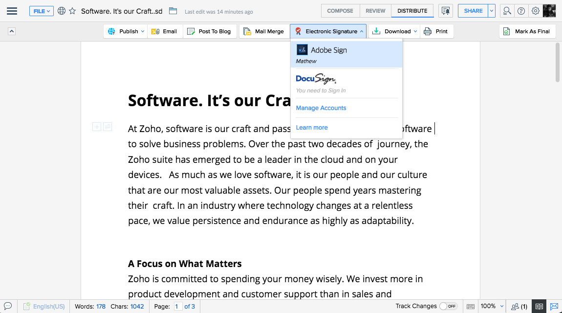 Easily accelerate the creation, review, and signing of business documents, such as NDAs and sales contracts. With Zoho Writer's built-in signing options, go paperless and manage signature collection online through multiple services, such as Zoho Sign, DocuSign, and SignEasy.