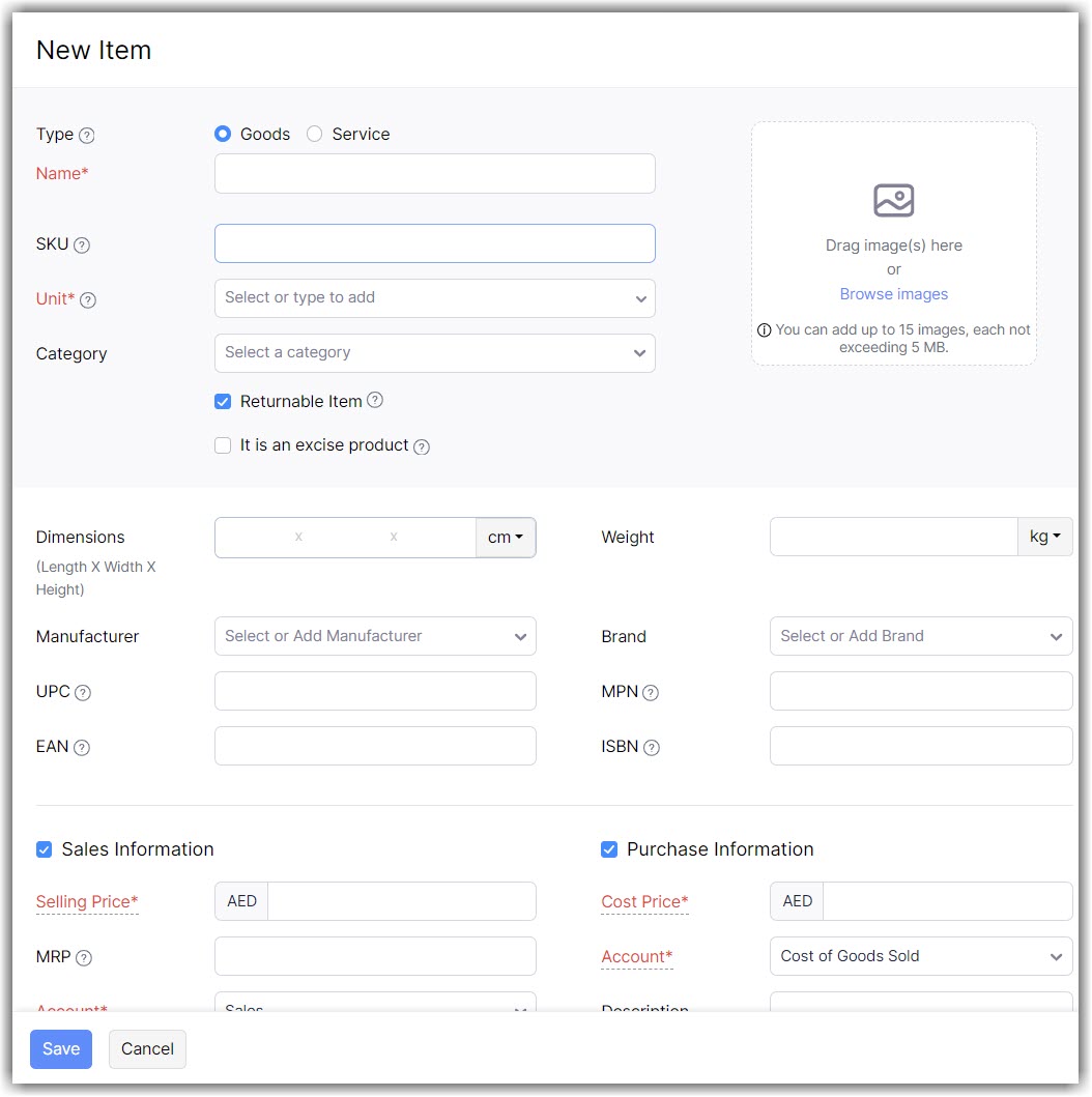 - Item Image: Upload images of the product. The supported file formats are .gif, .png, ,jpeg, .jpg, and .bmp, and each file can be a maximum of 5MB. You can also mark an image as primary, which will then be displayed in all the transactions for the item.