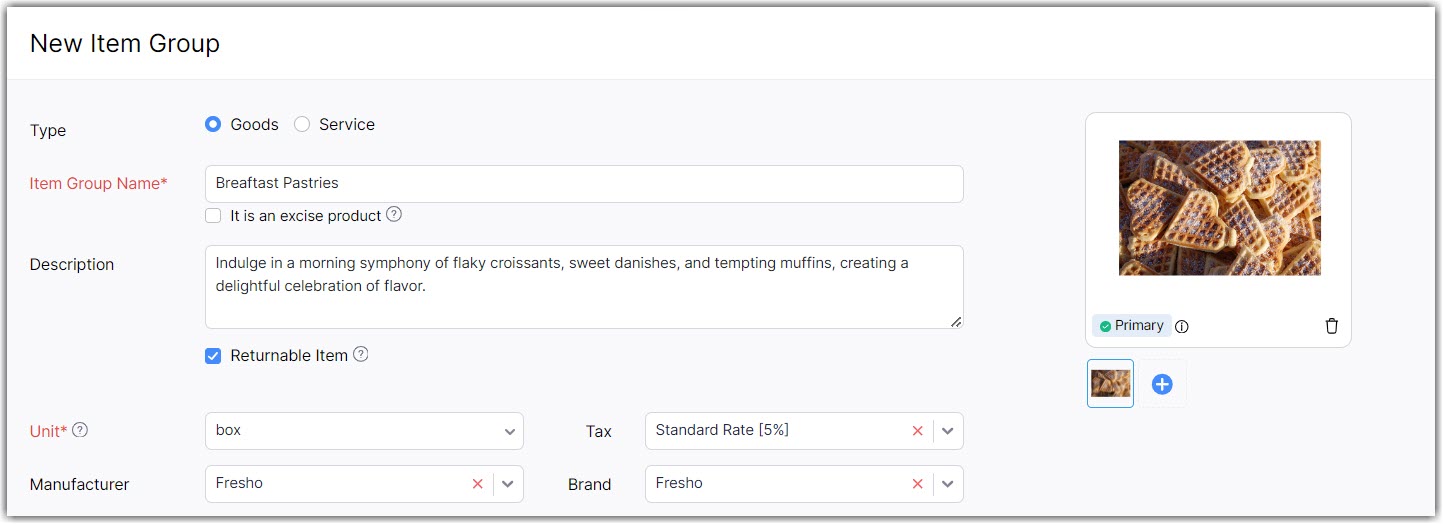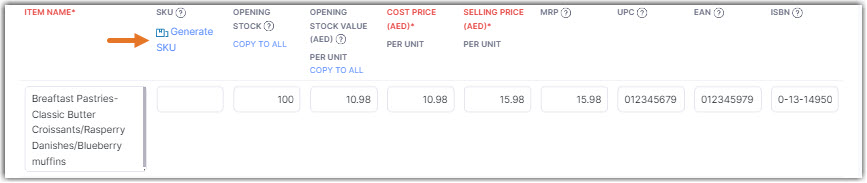 An item group might consist of numerous items. In such a case, specifying a SKU for individual items in the item group will be difficult and time-consuming. To avoid that, the Generate SKU option lets you configure a unique SKU value for all the items in the item group.