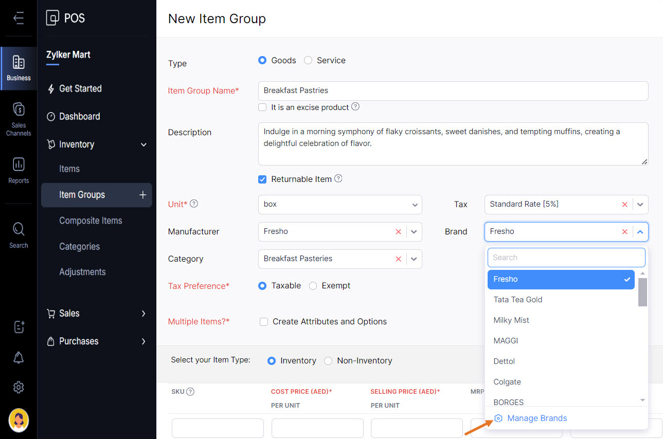 Multiple variants of an item can be manually grouped together in the Item Groups module in Zoho POS.