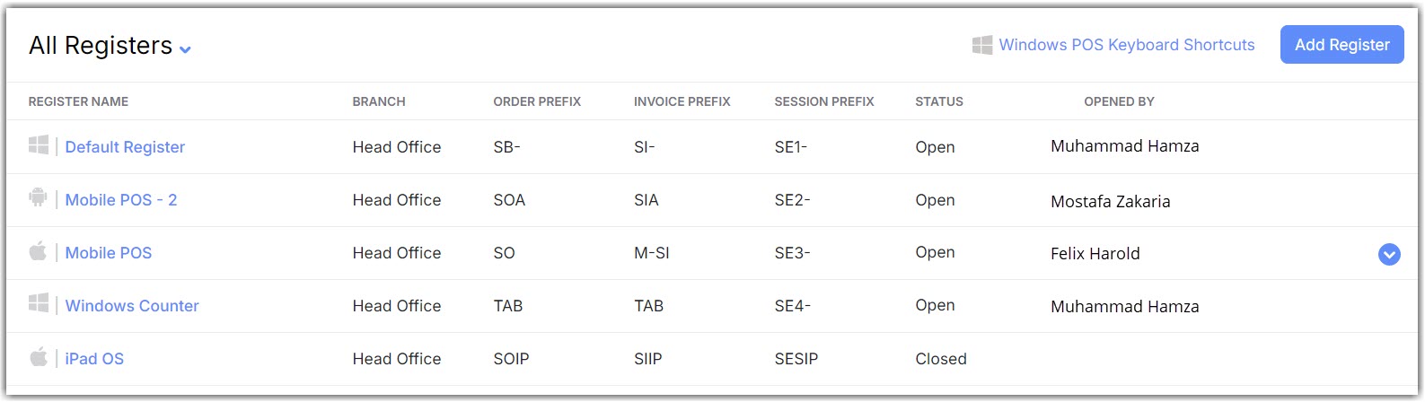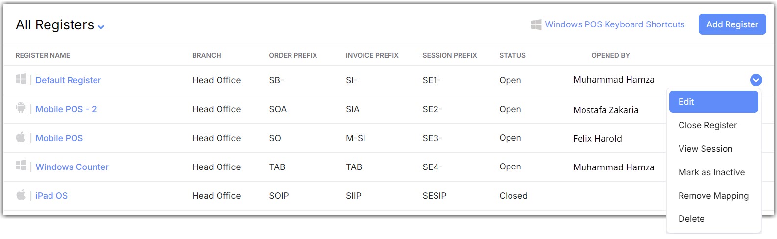 The Zoho POS web application is the only platform through which you can configure and edit these registers. By default, the web application is built with a single register. The web application displays an wholesome view of each of the registers, which includes all the available registers, associated branches, their order and invoice prefixes, the status (open/closed) of the register, and the name of the user who has opened the register. The web application also allows you to deactivate, un-map, and delete a register.