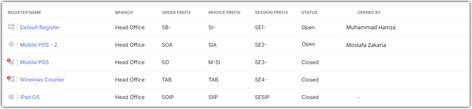 - Open: The register is mapped to a device and logged in. It can be actively used for billing.