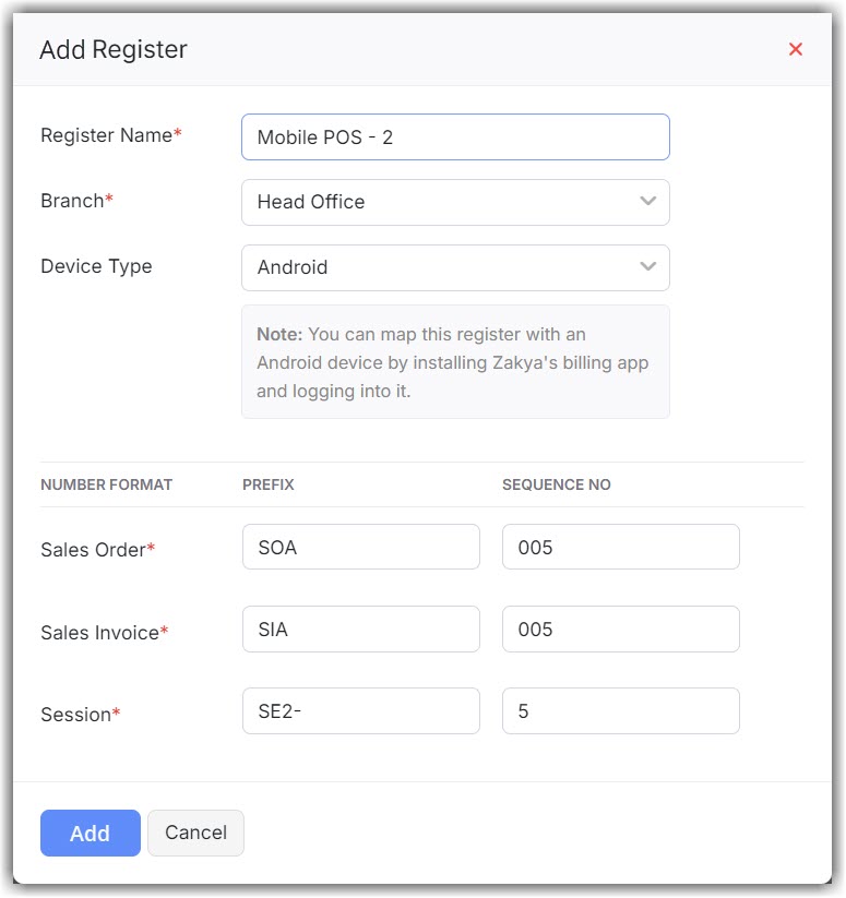 While configuring or editing the registers, the entered order number and invoice numbers will be reflected in the bill. The invoice and order numbers serve to track orders and keep the data organized. The format is alphanumeric, containing a prefix and a sequence number. If you need to change or edit the order and invoice prefix, you can edit them after closing the register. It cannot be changed while the register is active and open. However, the name of the register and the Device Type can be edited while the register is active. The order prefix and the invoice prefix appear on the bill.