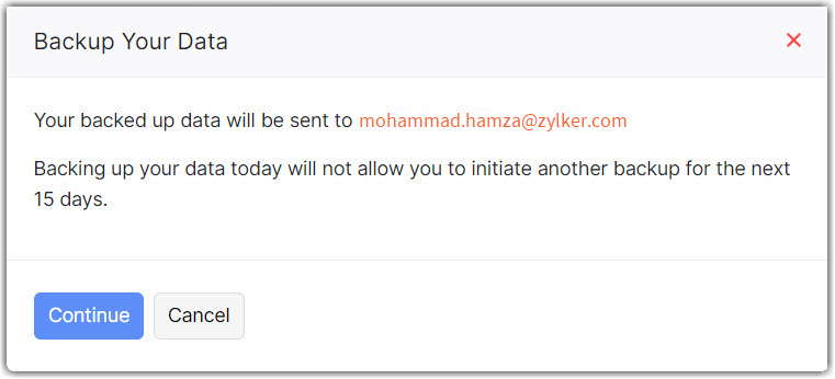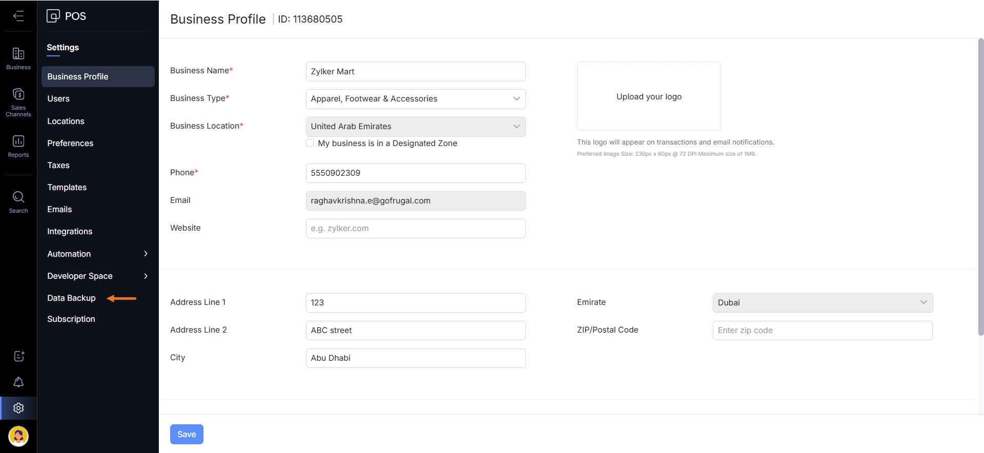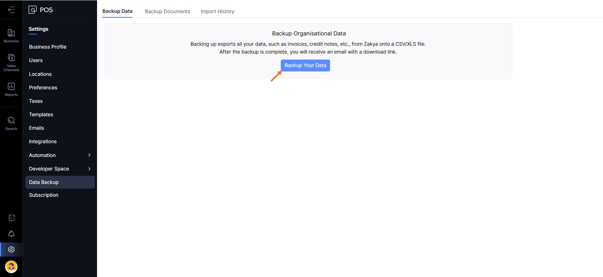 - You must be an admin user in the Zoho POS organization to create a data backup.