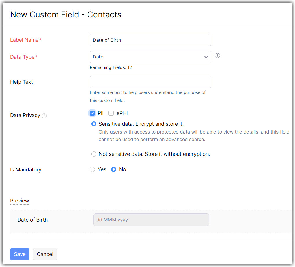 Custom Fields in Zoho POS allow you to quickly and easily add data against fields created by you. When you create a new custom field, you can choose to encrypt and save the Personally Identifiable Information (PII). While creating your custom field, you can choose either PII or ePHI based on the information that you are collecting.