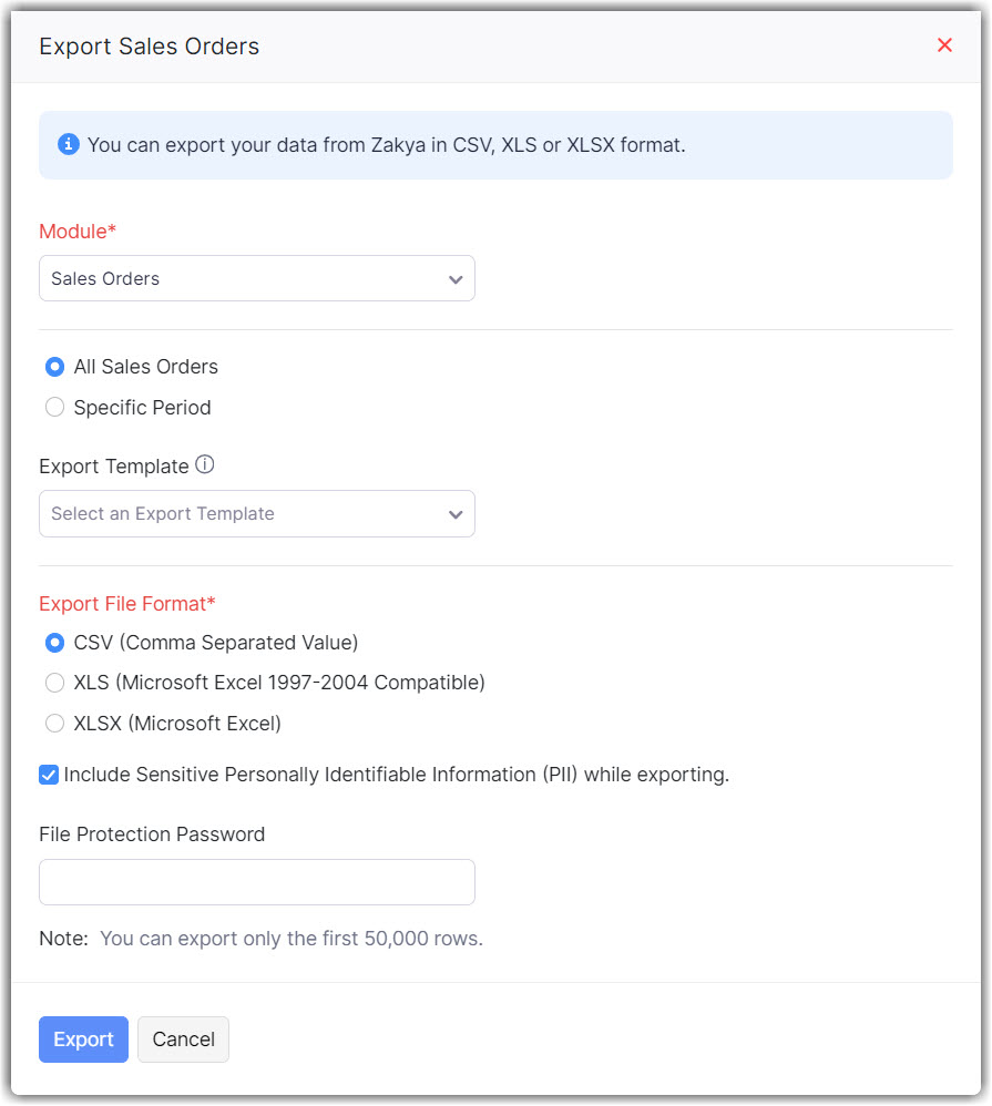 - Enable Include Sensitive Personally Identifiable Information (PII) while exporting.