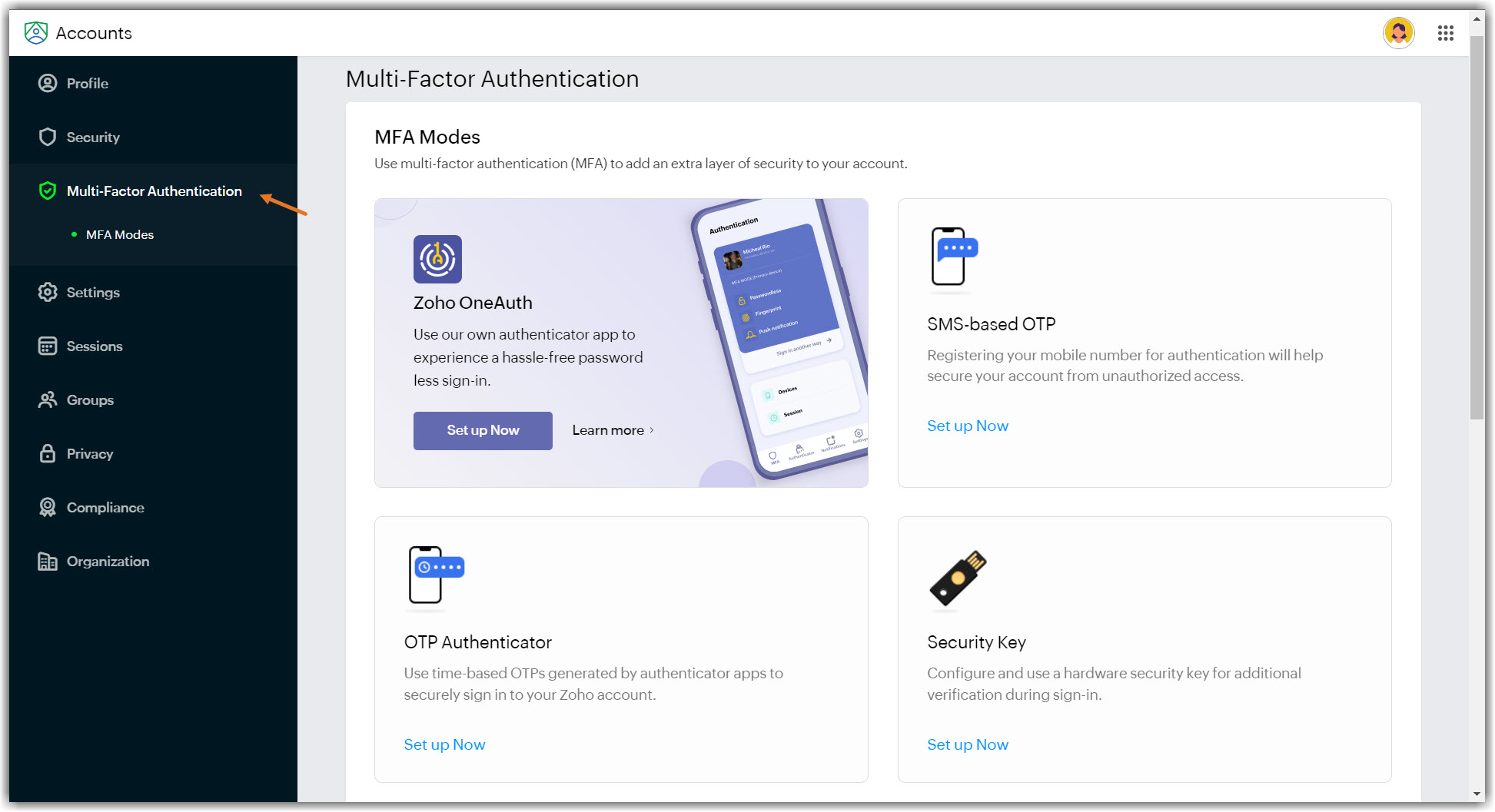 - Select Multi-factor Authentication, choose your secondary verification method, and click Set up Now.