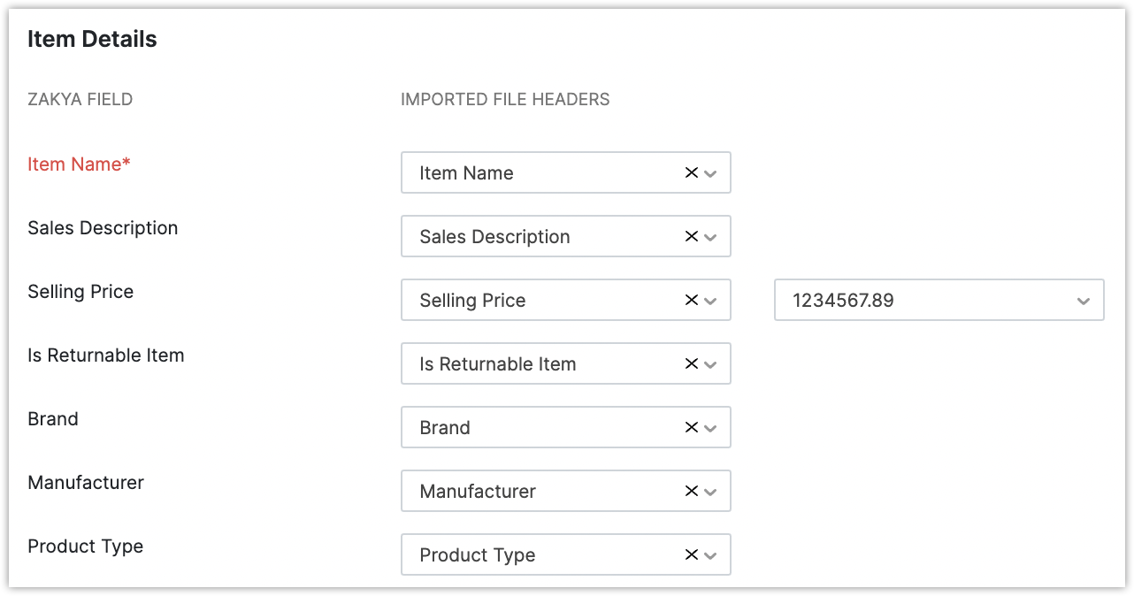 The fields in the Items module must be mapped with the appropriate column headers from the import file, so that the value gets added to the appropriate field. By default, the fields will be mapped. You can also map the unmapped fields manually.