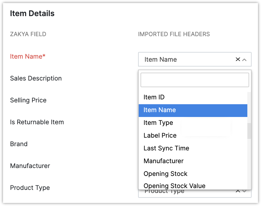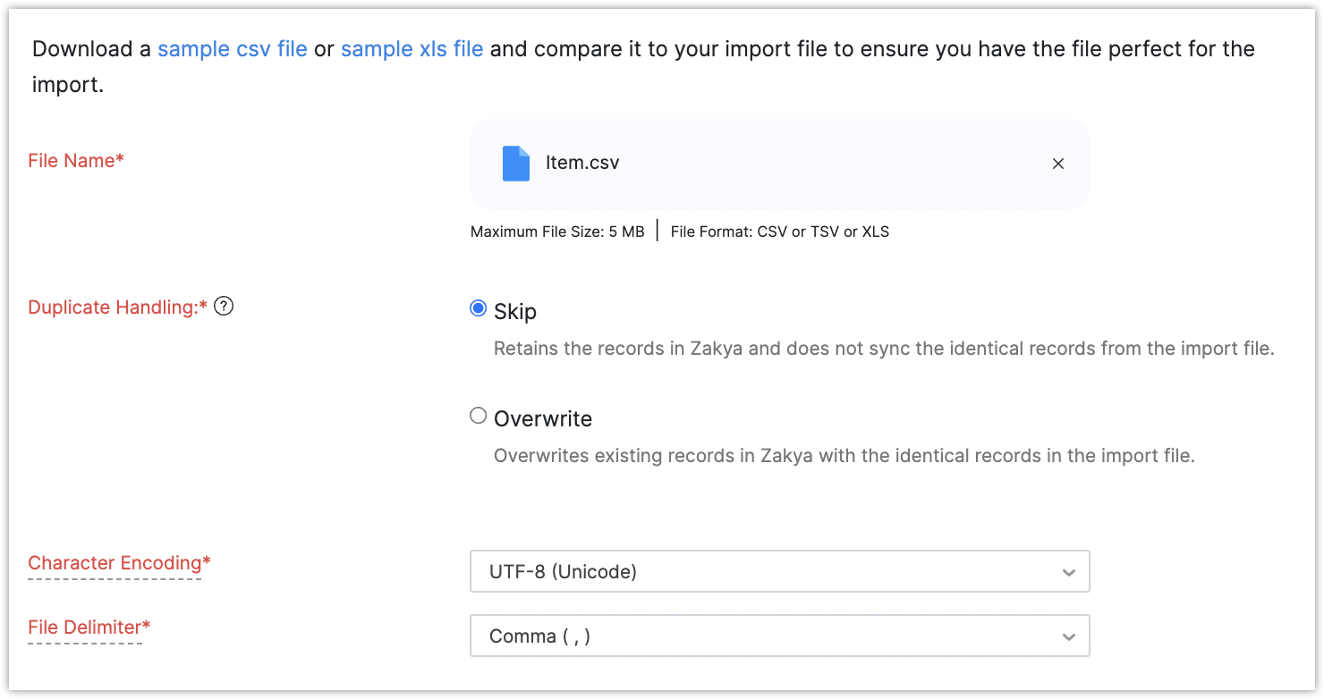 - Select the field based on which you want to overwrite the item details from the drop-down list. This option appears only if the Overwrite option is selected for Duplicate Handling.