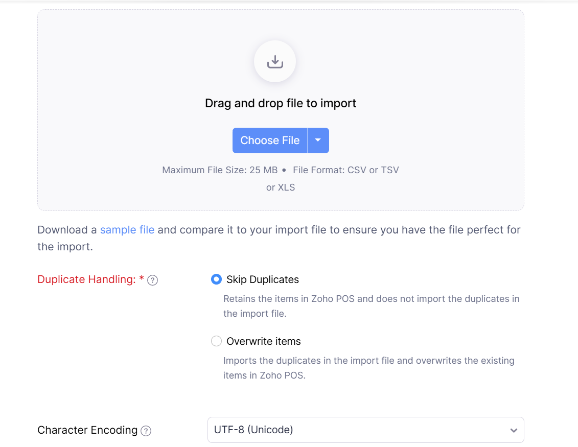 - Duplicate Handling: You have two options when an item present in the import file is already present in Zoho POS:- Skip: The Item from the Import file will be skipped if a duplicate item is found in Zoho POS.