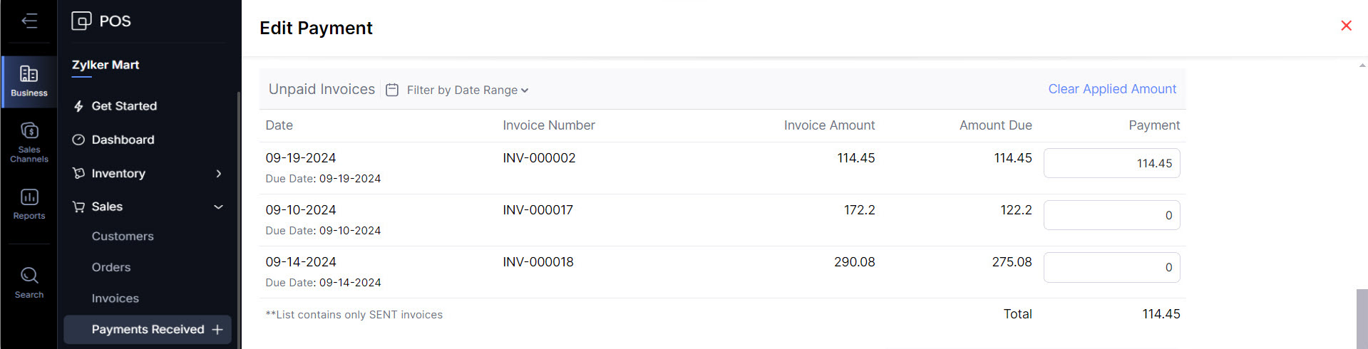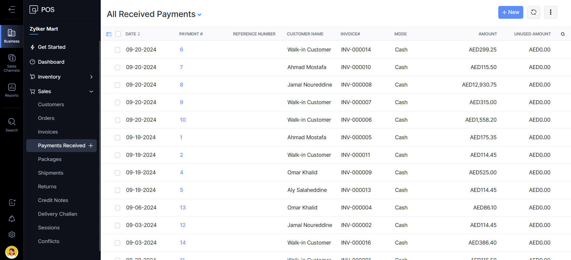 - Navigate to Business > Sales > Payments Received.