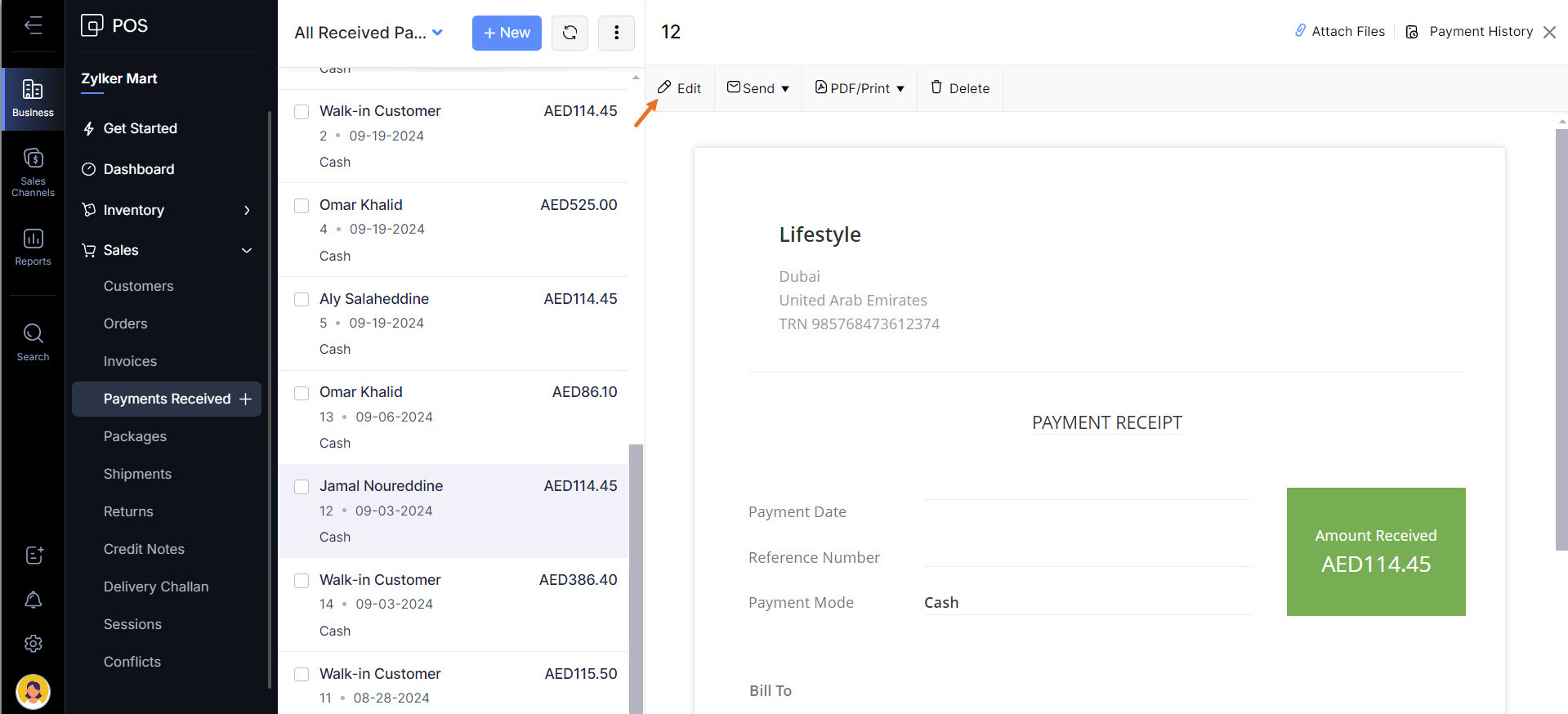 - Select a payment received record and click Edit.