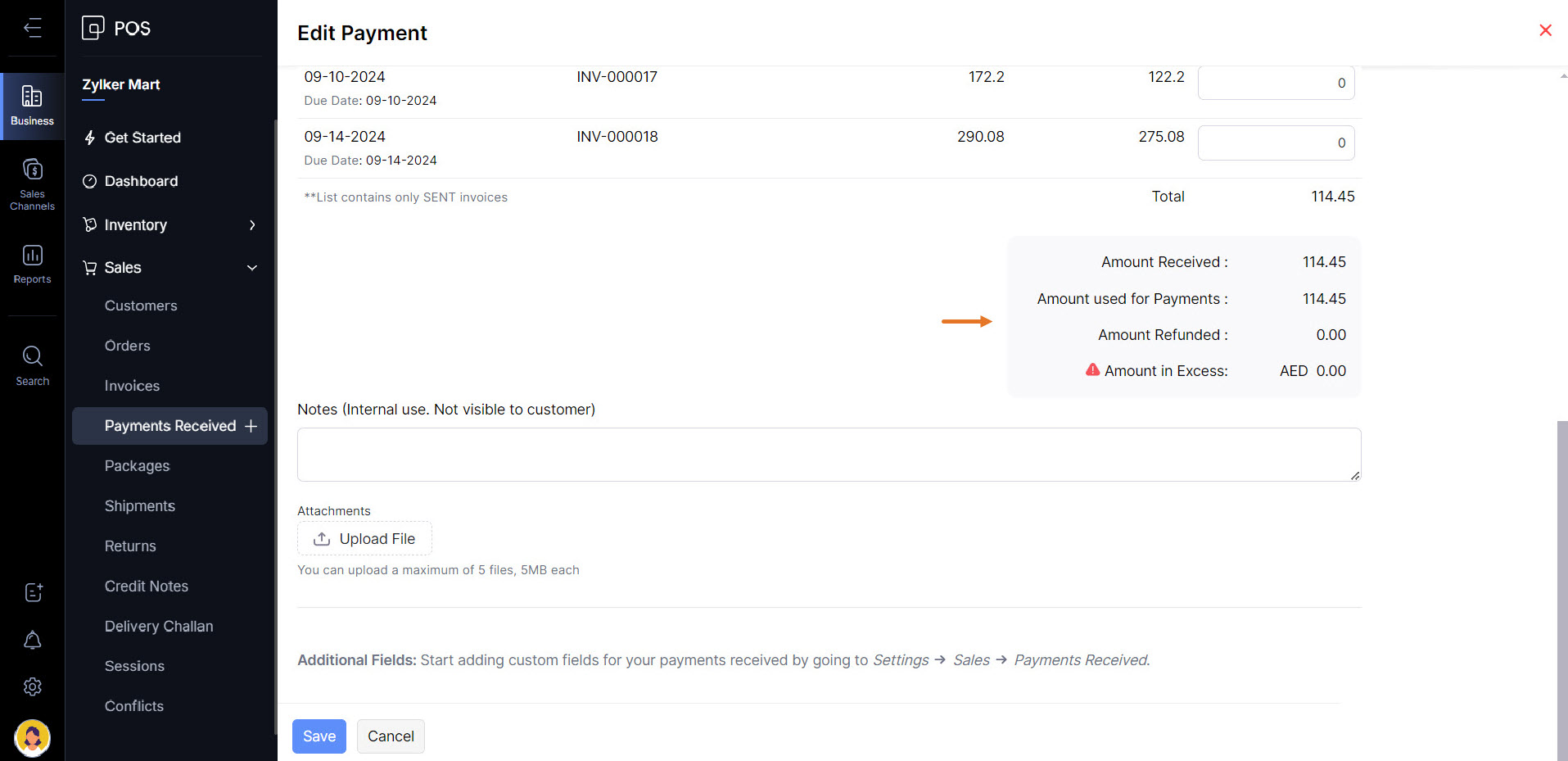 - Upon finishing, you can the summary below the invoices which will show the Amount Refunded, Amount Received, Amount used for Payments, and amount in excess.