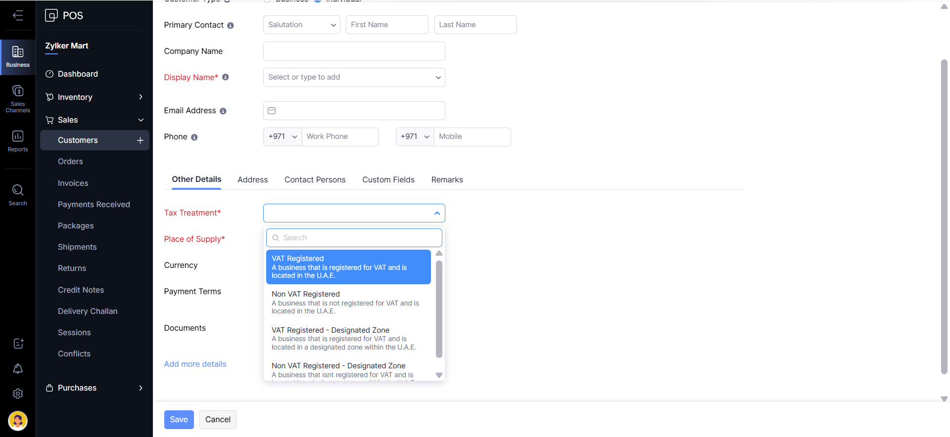 As a VAT-compliant business, you must configure your customer and vendor tax treatment in order to create a transaction for them. This is the tax rates applied to each transaction will be determined by the customer and vendor's tax treatment as well as the location of supply. You can specify the tax treatment when creating customers and vendors.