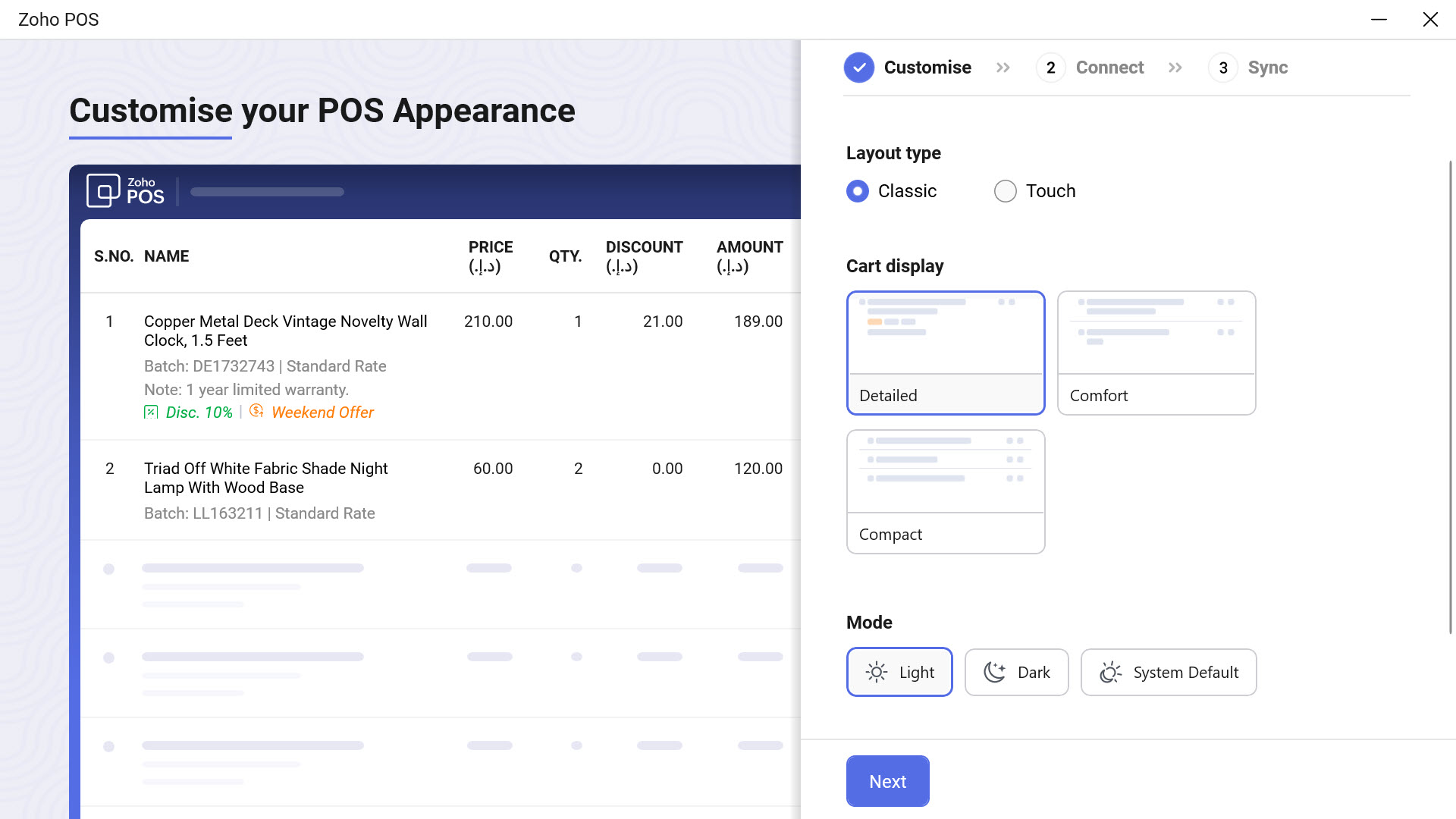 In a retail store, the device that is used for billing can be of different types, such as a standard desktop, laptop, and touch screen device. Zoho POS POS is compatible with any device that runs on the Windows operating system. There are two different modes that can be chosen based on the type of device at your store: Classic, and Touch.