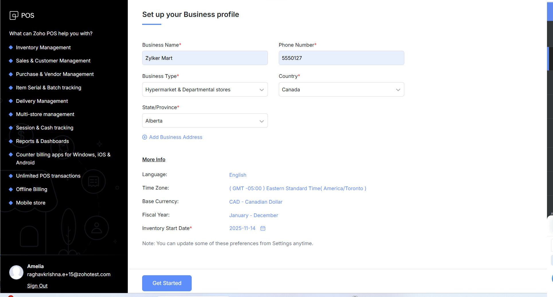 Once the sign up process is completed, you can enter the basic information about your organization such as the name, phone number, address, currency, language, fiscal year, etc. to get started with Zoho POS.
