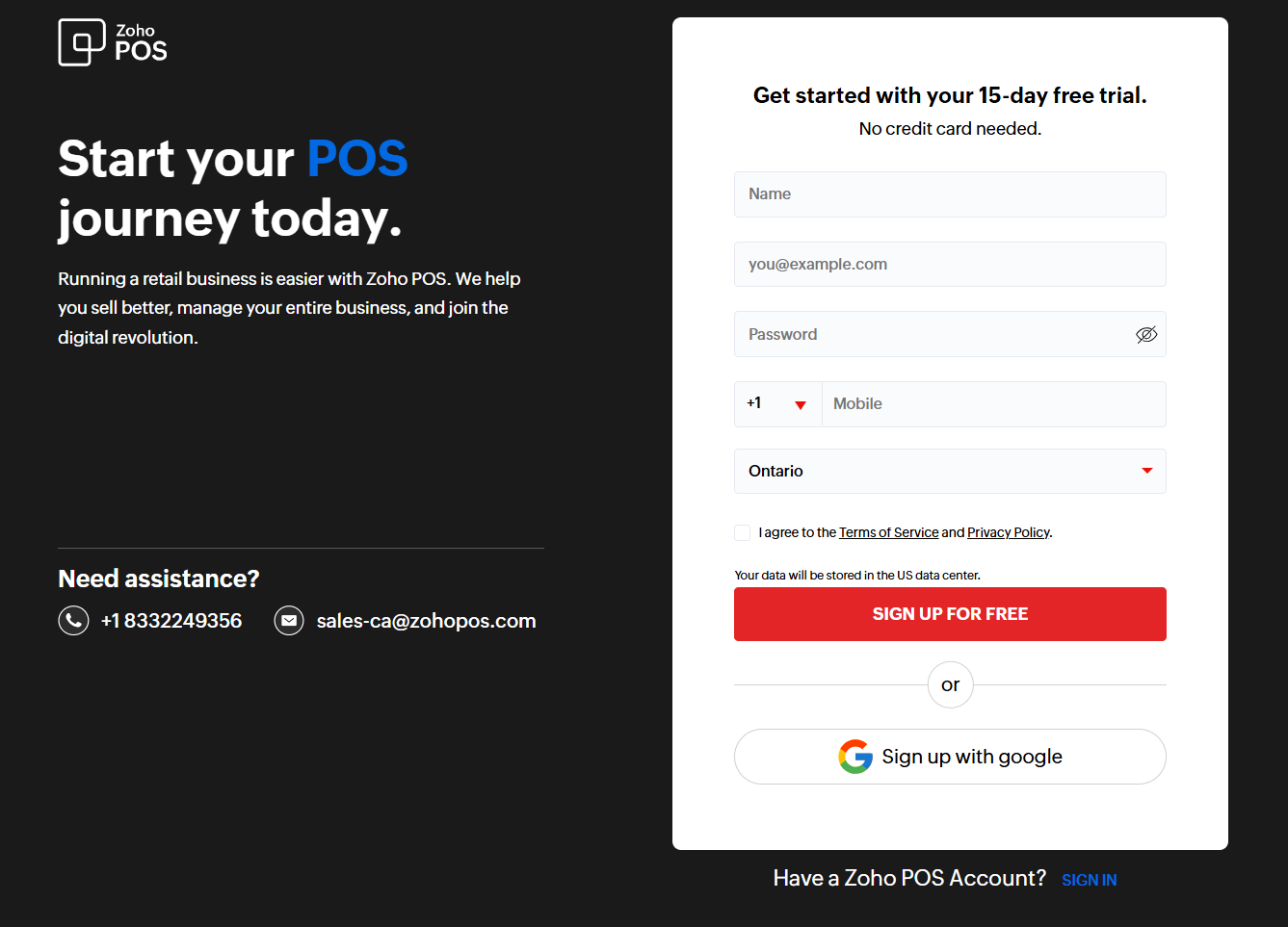 Click Sign up for free.You can also sign up for Zoho POS using your Google or LinkedIn accounts.