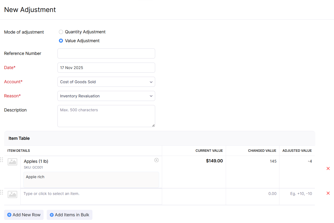 Enter the Changed Value.The Adjusted Value will be calculated automatically.
